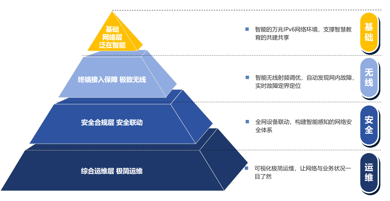 在无线覆盖建设上,顺利获得无线网覆盖的建设为学校给予更多网络接入方式,满足各类移动应用接入的需求,支持账户漫游、无感认证,全面实现学生学习泛在化、教师教学移动化、校园管理实时化。再者,基于认证平台实现全网有线无线终端的统一身份认证,对用户的访问行为进行统一管理和控制,强化访问控制策略,限制非授权用户的访问,降低网络被攻击的风险。